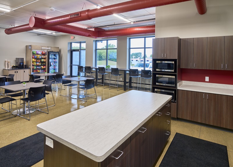 - A versatile cafeteria space: The break area was designed to function as both a daily workspace retreat and a venue incorporating varied seating arrangements to maximize flexibility.